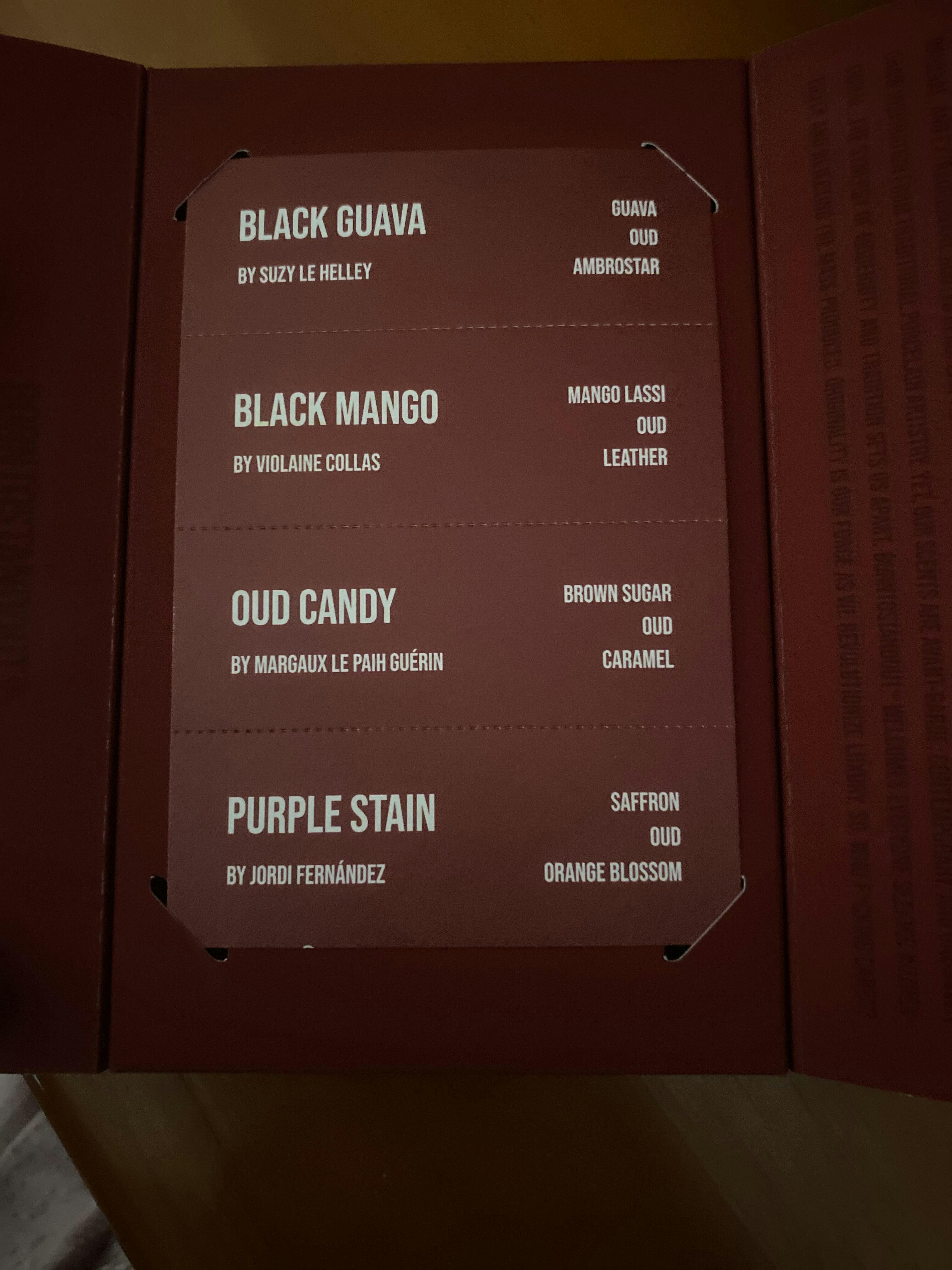 Purple stain , se me hizo más innovador sin embargo, oud guava también está genial vas pasando y deja estela a guayaba. Oud candy me gusto también y tengo pendiente black mango . Los 3 me han gustado.